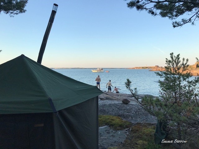 Seuraavaksi oli selätettävä korvienvälidemonit. Tarvitseeko leirillä sukeltaakseen olla hyvä sukeltaja tai voinko minä lähteä mukaan? Kuinka aioin uskaltaa käydä miesseurueessa puskapissalla? Makkipakki eli metsäinen ulkokäymälä ei jännittänyt, koska sen suhteen olisimme kaikki samalla viivalla: käytävä tai kärsittävä seuraukset. Oli tartuttava härkää sarvista ja itseään raivelista. Jos tällainen asia olisi tulema leirille lähdön esteeksi, olisi minun todettava, että olen varsinainen jänishousu ja sehän ei sovi! Sopivan suhteellisuudentajun valossa päätin olla surematta asiaa ja sen sijaan järjestää kaikille jotain luksusta, nimittäin saunateltan! Julmettu määrä ylimääräistä kannettavaa, koska saareen mukaan lähtisi paitsi usean kymmenen kilon telttarakenteet ja kiukaat, mutta myös kivet, saunavedet ja puut. Kuinka ollakaan, tästä tuli jokaisen illan kohokohta: päivän sukellusten jälkeen oli mahtavaa istahtaa makeaan löylyyn, katsella telttakankaan muovisesta ikkunasta merimaisemaa ja siemailla jo valmiiksi kädenlämpöistä saunajuomaa.